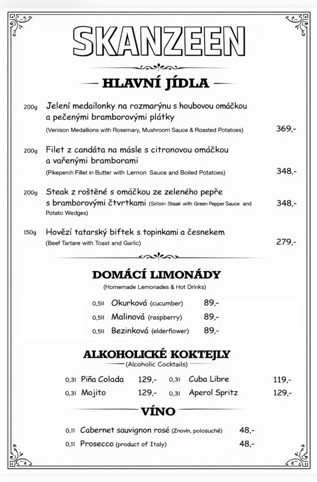 Restaurace Skanzeen je zaměřena na tradiční českou, slovenskou a valašskou kuchyni. Veškerá jídla vychází z originálních starých receptů prababiček bábinek a babiček. Plně dodržujeme kvalitu, originalitu i chuť těchto staroslovanských lahůdek.